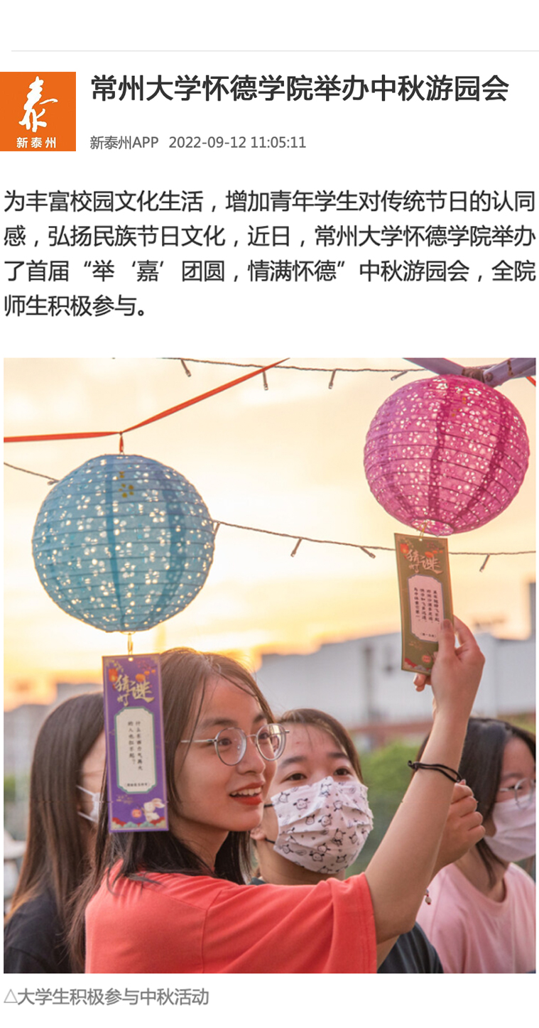 为丰富校园文化生活,增加青年学生对传统节日的认同感,弘扬民族节日文化,近日,常州大学怀德学院举办了首届“举‘嘉’团圆,情满怀德”中秋游园会,全院师生积极参与。