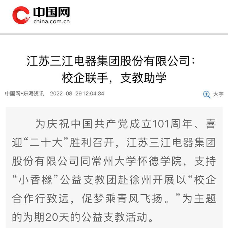 为庆祝中国共产党成立101周年、喜迎“二十大”胜利召开,江苏三江电器集团股份有限公司同常州大学怀德学院,支持“小香橼”公益支教团赴徐州开展以“校企合作行致远,促梦乘青风飞扬。”为主题的为期20天的公益支教活动。