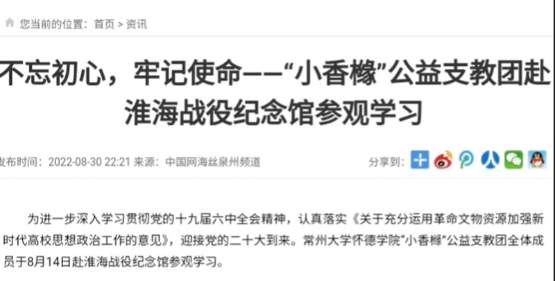 为进一步深入学习贯彻党的十九届六中全会精神,认真落实《关于充分运用革命文物资源加强新时代高校思想政治工作的意见》,迎接党的二十大到来。常州大学怀德学院“小香橼”公益支教团全体成员于8月14日赴淮海战役纪念馆参观学习。