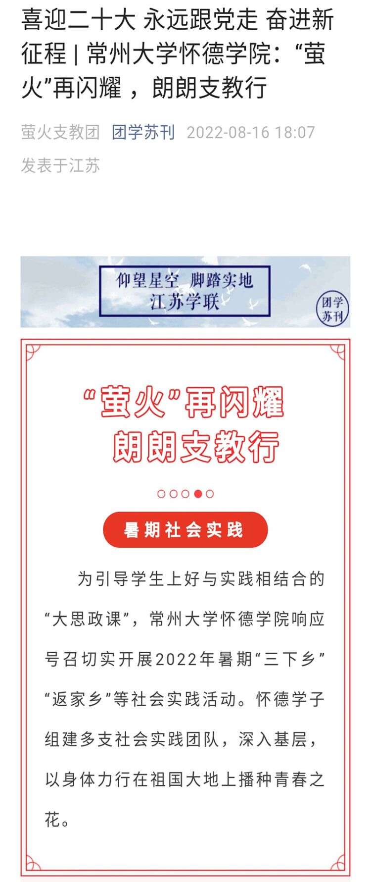 为引导学生上好与实践相结合的“大思政课”,常州大学怀德学院响应号召切实开展2022年暑期“三下乡”“返家乡”等社会实践活动。怀德学子组建多支社会实践团队,深入基层,以身体力行在祖国大地上播种青春之花。