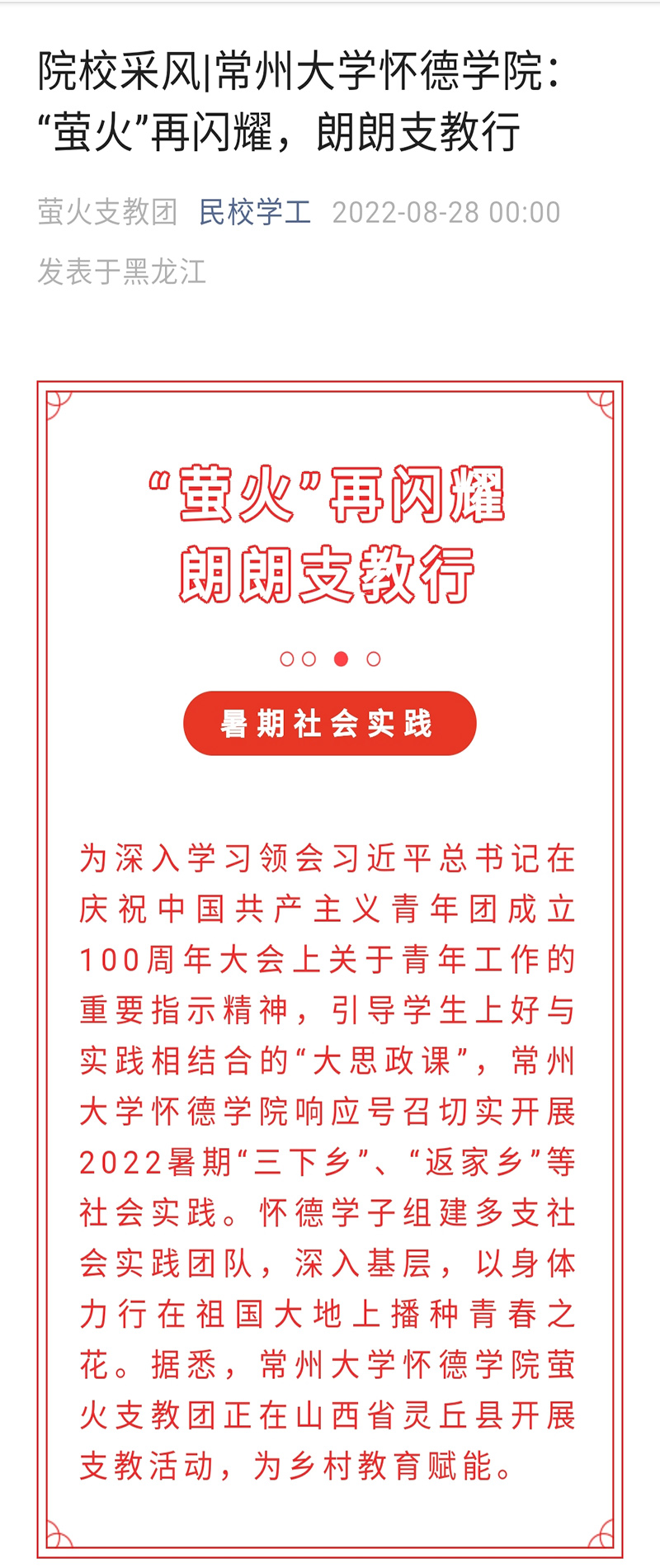 为引导学生上好与实践相结合的“大思政课”,常州大学怀德学院响应号召切实开展2022年暑期“三下乡”“返家乡”等社会实践活动。怀德学子组建多支社会实践团队,深入基层,以身体力行在祖国大地上播种青春之花。