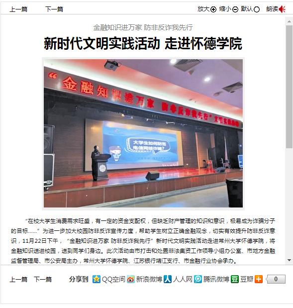 “在校大学生消费需求旺盛,有一定的资金支配权,但缺乏财产管理的知识和意识,极易成为诈骗分子的目标……”为进一步加大校园防非反诈宣传力度,帮助学生树立正确金融观念,切实有效提升防非反诈意识,11月22日下午,“金融知识进万家 防非反诈我先行”新时代文明实践活动走进常州大学怀德学院,将金融知识送进校园,送到同学们身边。此次活动由市打击和处置非法集资工作领导小组办公室、市地方金融监督管理局、市公安局主办,常州大学怀德学院、江苏银行靖江支行、市金融行业协会承办。