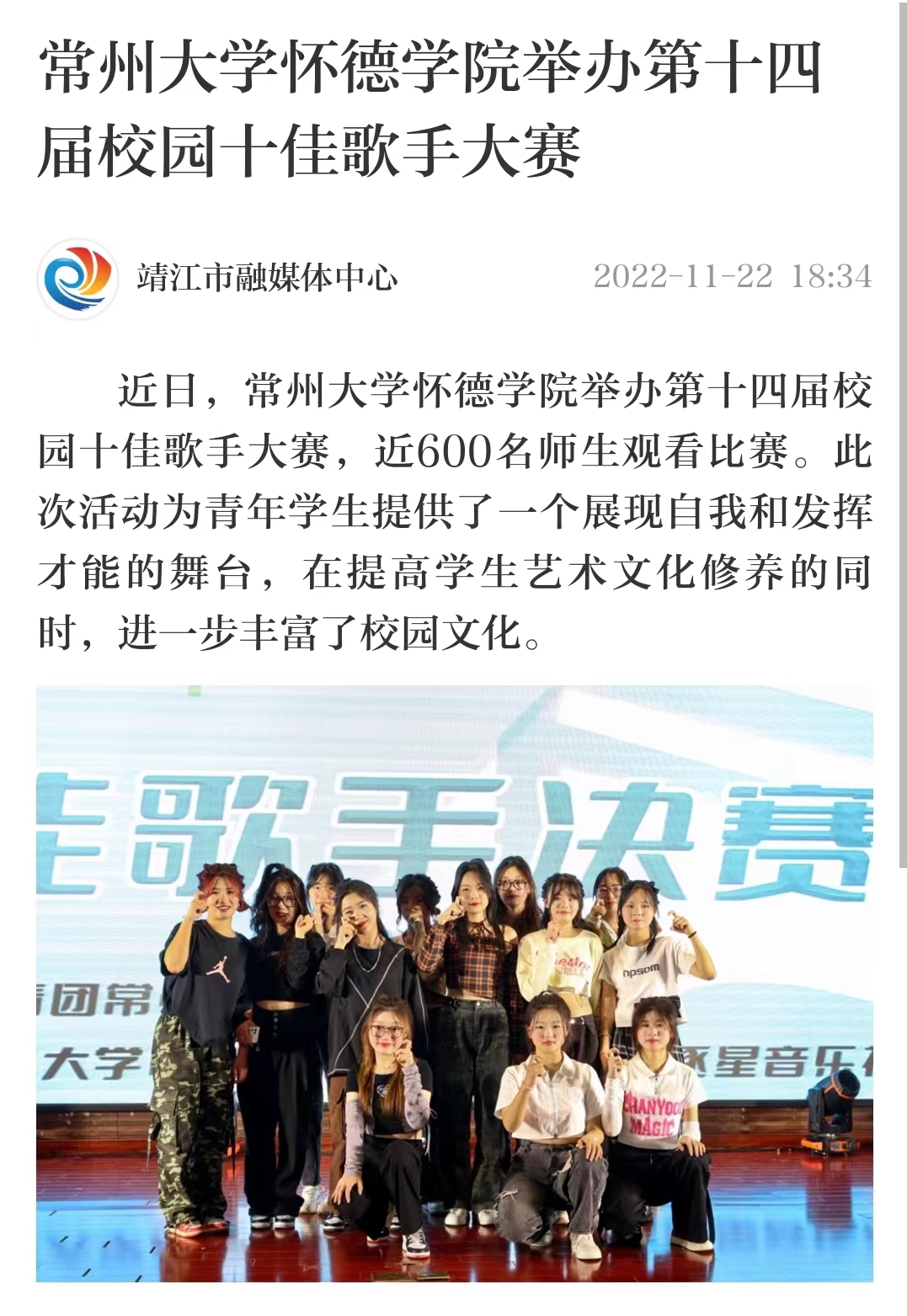 近日,常州大学怀德学院举办第十四届校园十佳歌手大赛,近600名师生观看比赛。此次活动为青年学生提供了一个展现自我和发挥才能的舞台,在提高学生艺术文化修养的同时,进一步丰富了校园文化。