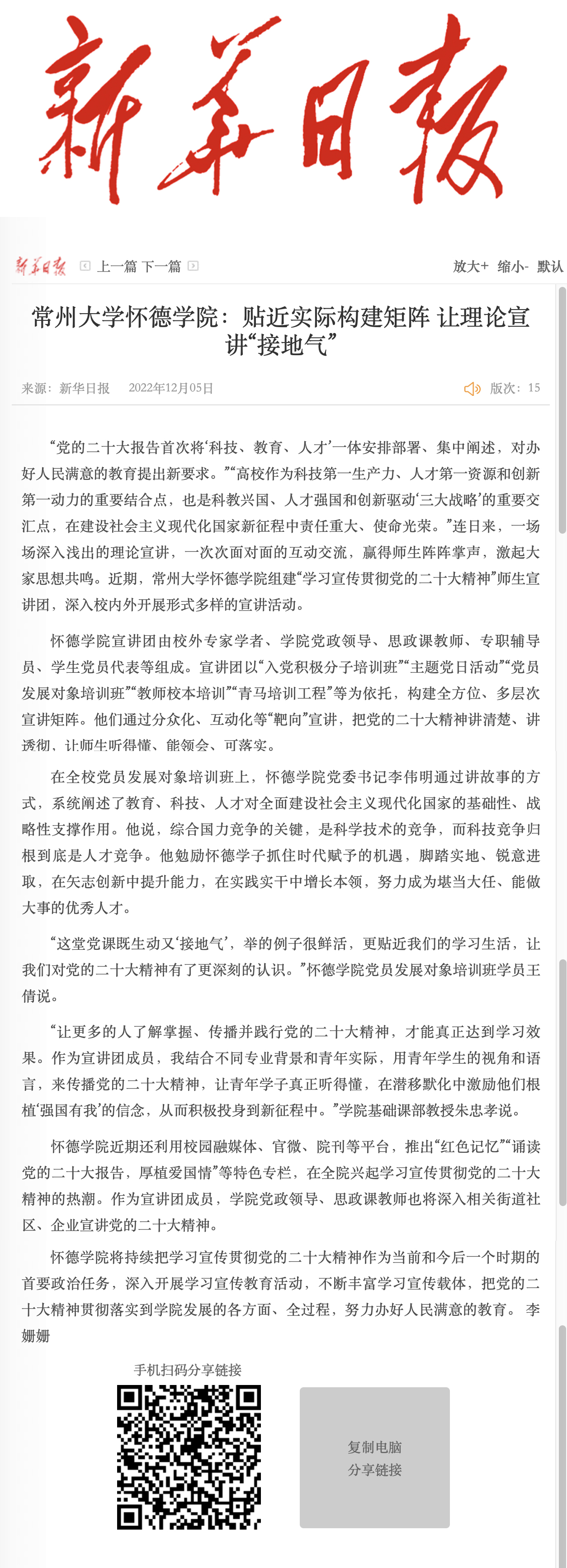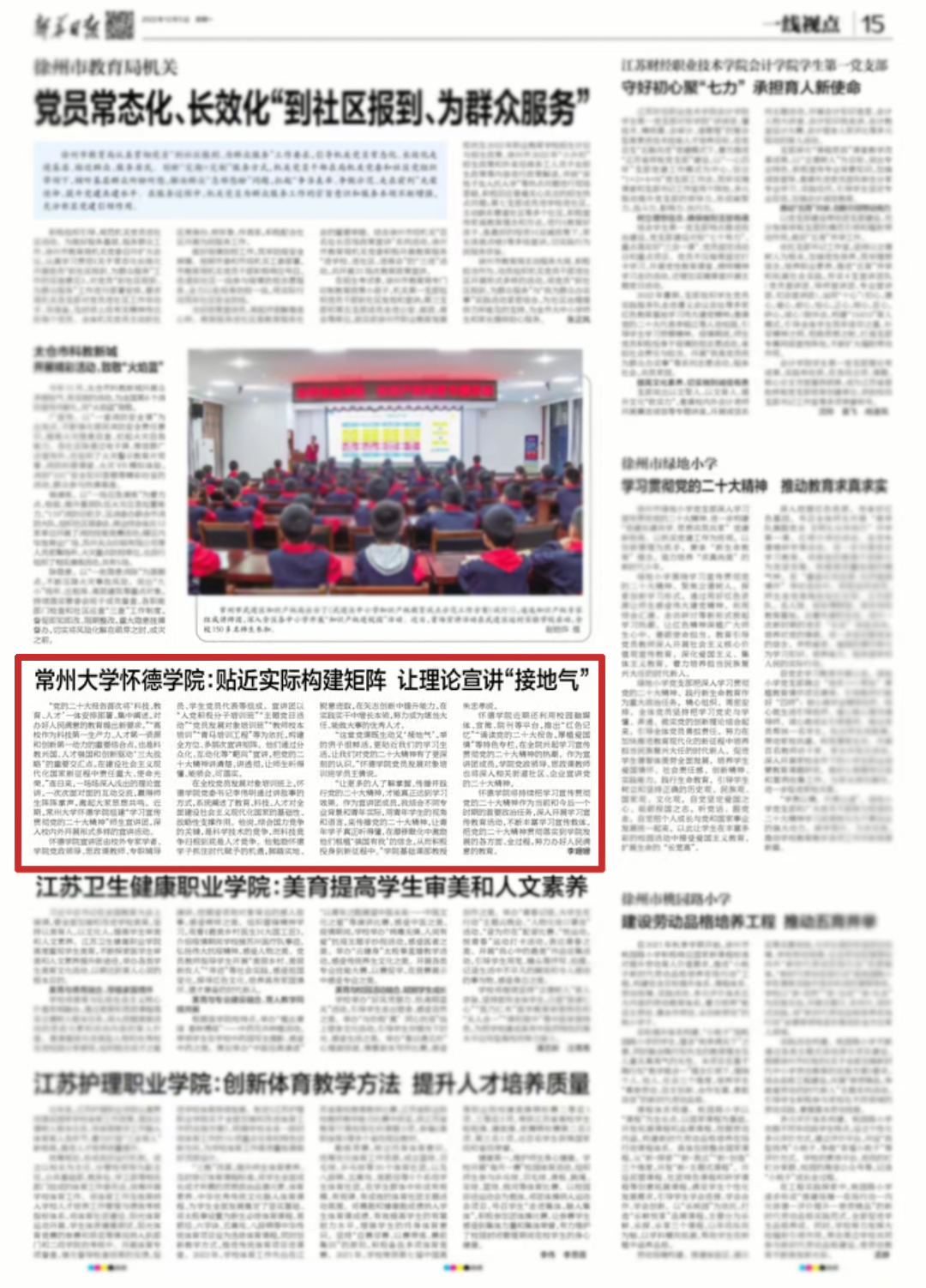“党的二十大报告首次将‘科技、教育、人才’一体安排部署、集中阐述,对办好人民满意的教育提出新要求。”“高校作为科技第一生产力、人才第一资源和创新第一动力的重要结合点,也是科教兴国、人才强国和创新驱动‘三大战略’的重要交汇点,在建设社会主义现代化国家新征程中责任重大、使命光荣。”连日来,一场场深入浅出的理论宣讲,一次次面对面的互动交流,赢得师生阵阵掌声,激起大家思想共鸣。近期,常州大学怀德学院组建“学习宣传贯彻党的二十大精神”师生宣讲团,深入校内外开展形式多样的宣讲活动。