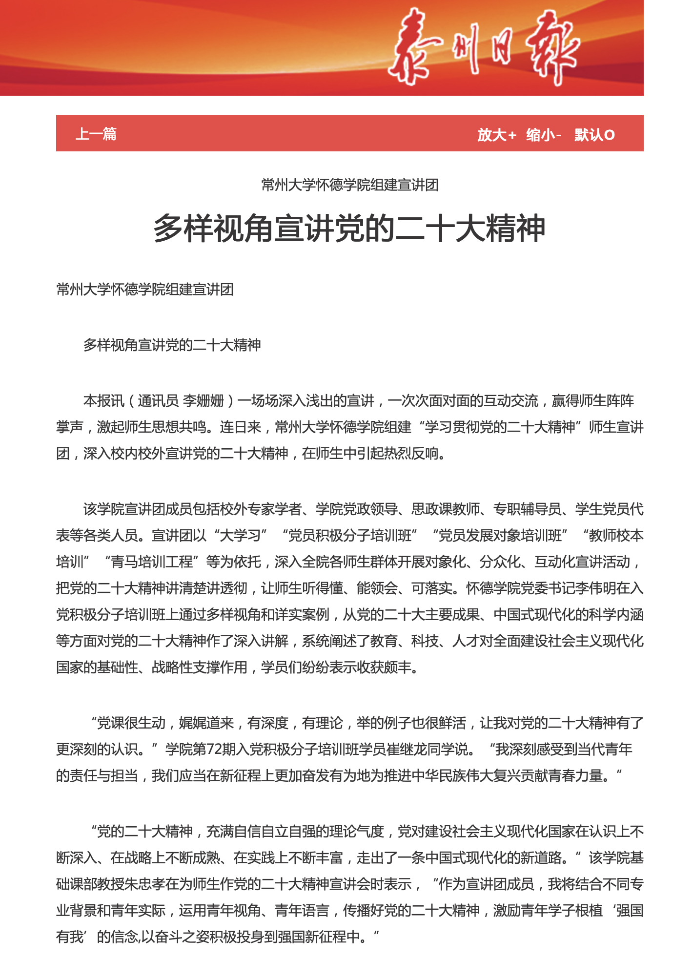 一场场深入浅出的宣讲,一次次面对面的互动交流,赢得师生阵阵掌声,激起师生思想共鸣。连日来,常州大学怀德学院组建“学习贯彻党的二十大精神”师生宣讲团,深入校内校外宣讲党的二十大精神,在师生中引起热烈反响。