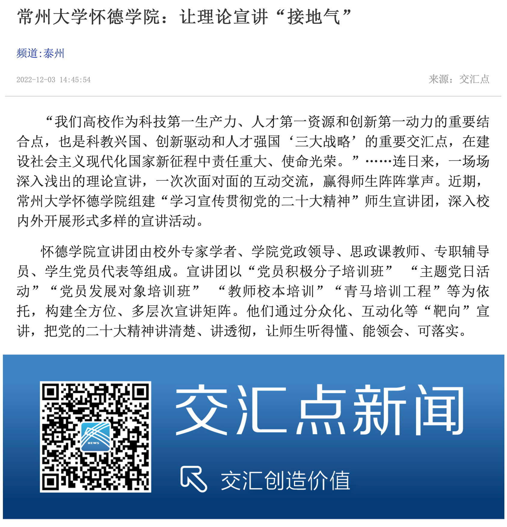 “我们高校作为科技第一生产力、人才第一资源和创新第一动力的重要结合点,也是科教兴国、创新驱动和人才强国‘三大战略’的重要交汇点,在建设社会主义现代化国家新征程中责任重大、使命光荣。”……连日来,一场场深入浅出的理论宣讲,一次次面对面的互动交流,赢得师生阵阵掌声。近期,常州大学怀德学院组建“学习宣传贯彻党的二十大精神”师生宣讲团,深入校内外开展形式多样的宣讲活动。