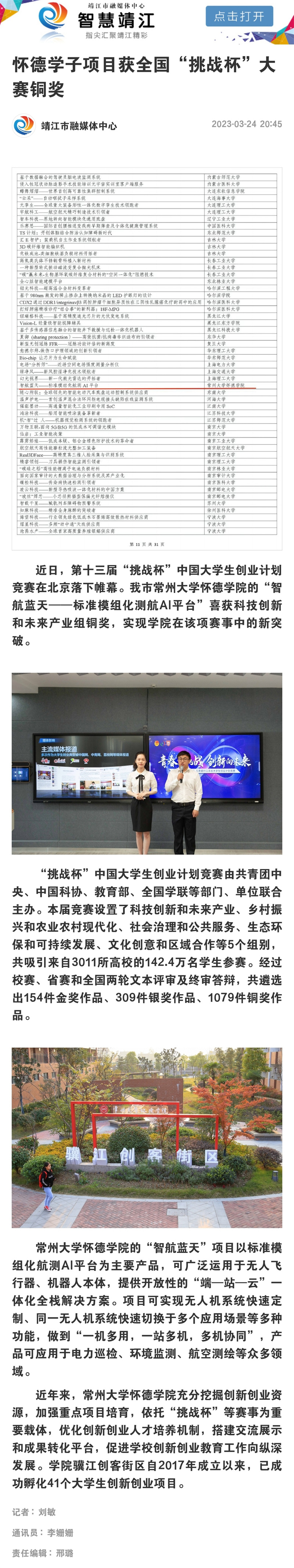 近日,第十三届“挑战杯”中国大学生创业计划竞赛在北京落下帷幕。我市常州大学怀德学院的“智航蓝天——标准模组化测航AI平台”喜获科技创新和未来产业组铜奖,实现学院在该项赛事中的新突破。