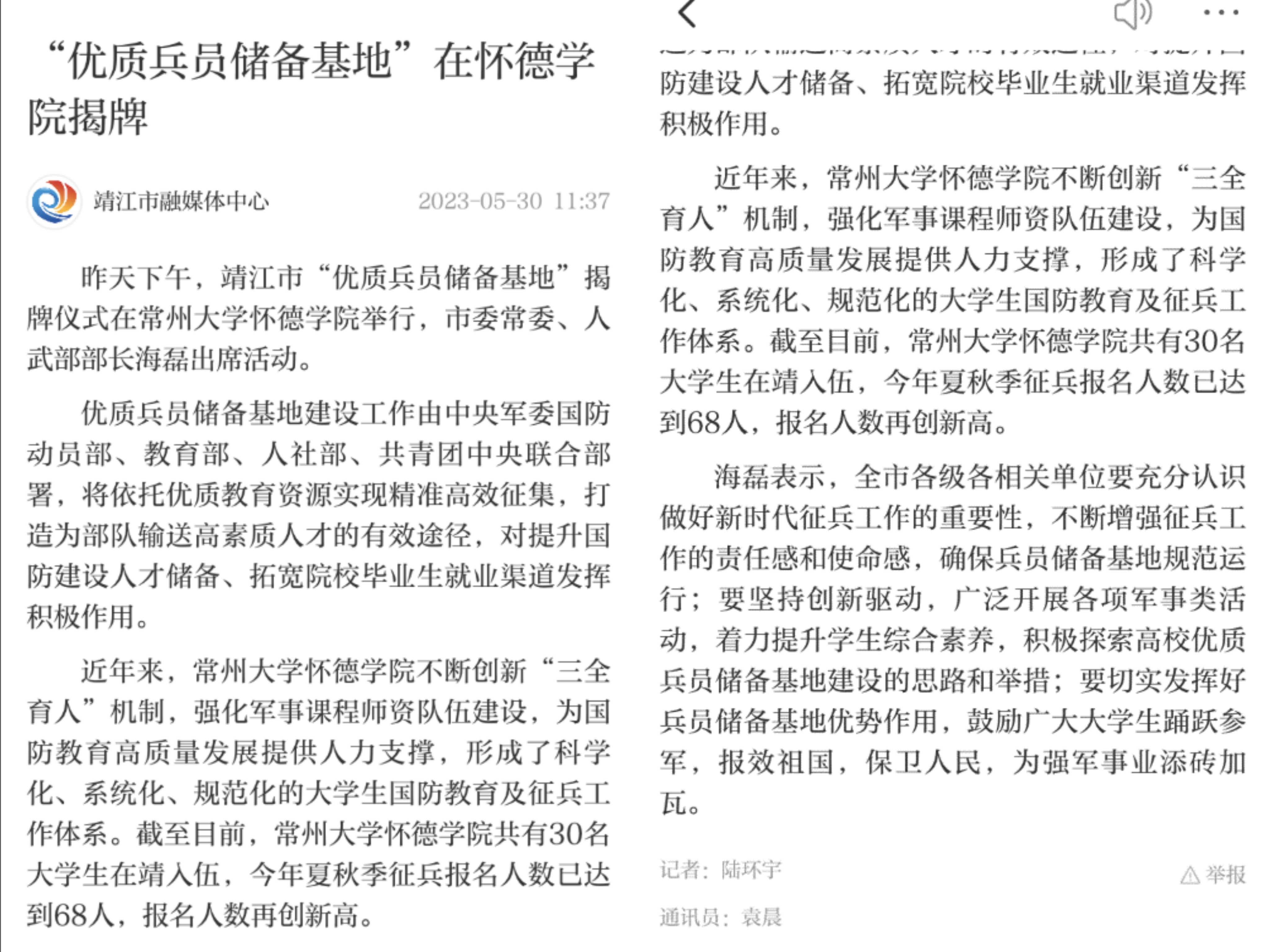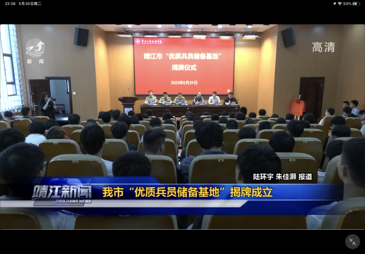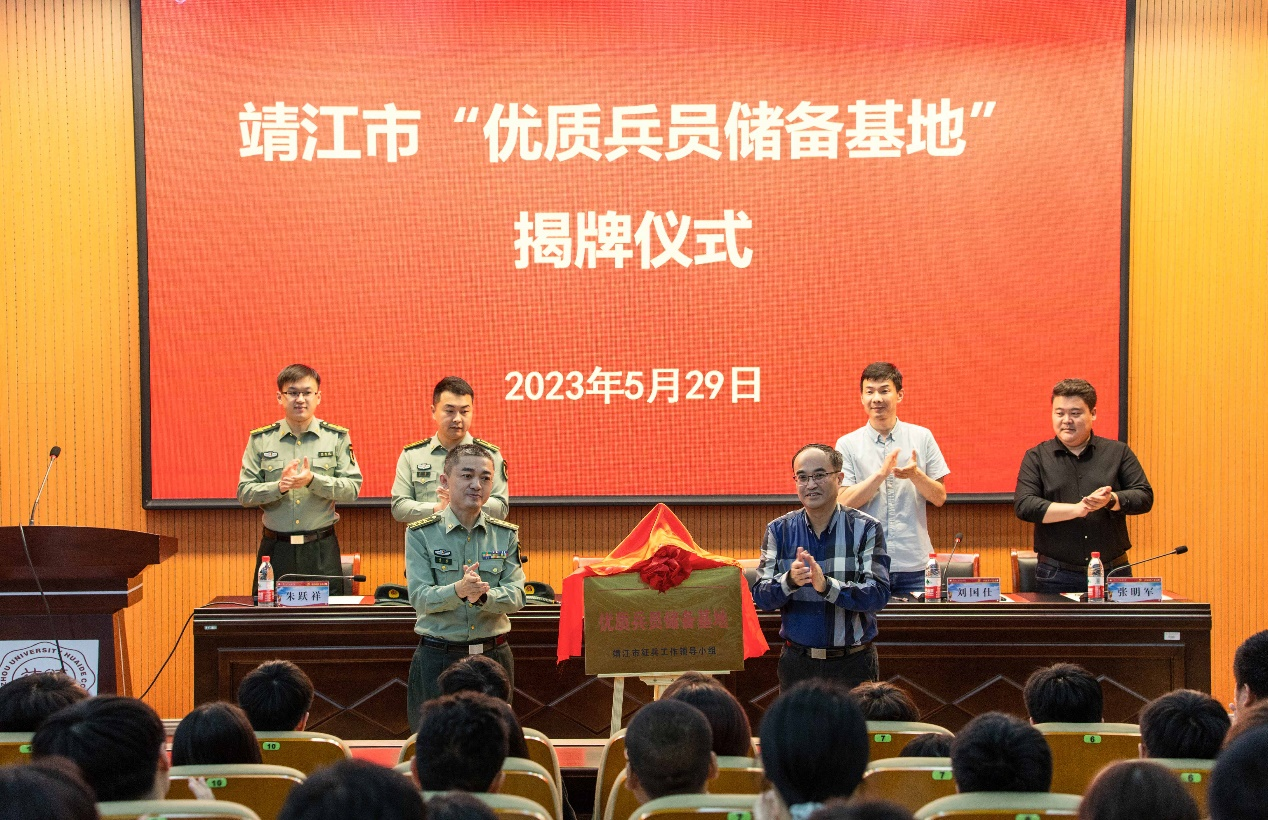 5月29日下午,靖江市“优质兵员储备基地”揭牌仪式在我院图书馆报告厅举行。靖江市委常委、人武部部长海磊,院党委书记李伟明,院征兵工作领导小组成员和退役学生代表参加会议。院党委副书记、副院长刘国仕主持会议。