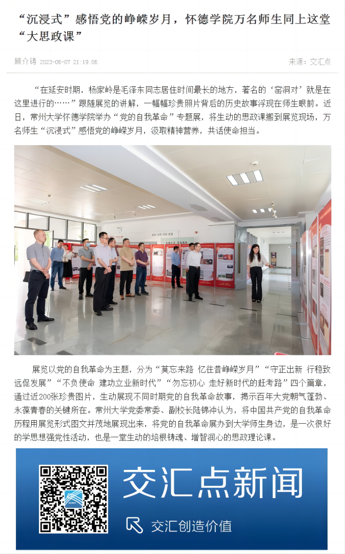 “在延安时期,杨家岭是毛泽东同志居住时间最长的地方,著名的‘窑洞对’就是在这里进行的……”跟随展览的讲解,一幅幅珍贵照片背后的历史故事浮现在师生眼前。近日,常州大学怀德学院举办“党的自我革命”专题展,将生动的思政课搬到展览现场,万名师生“沉浸式”感悟党的峥嵘岁月,汲取精神营养,共话使命担当。
