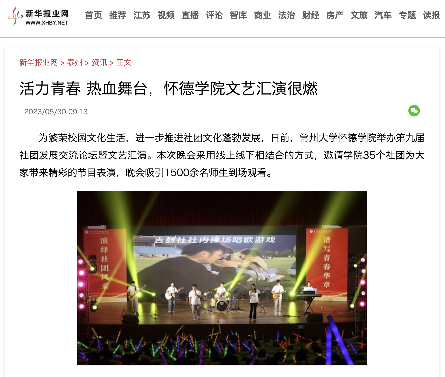 为繁荣校园文化生活,进一步推进社团文化蓬勃发展,日前,常州大学怀德学院举办第九届社团发展交流论坛暨文艺汇演。本次晚会采用线上线下相结合的方式,邀请学院35个社团为大家带来精彩的节目表演,晚会吸引1500余名师生到场观看。