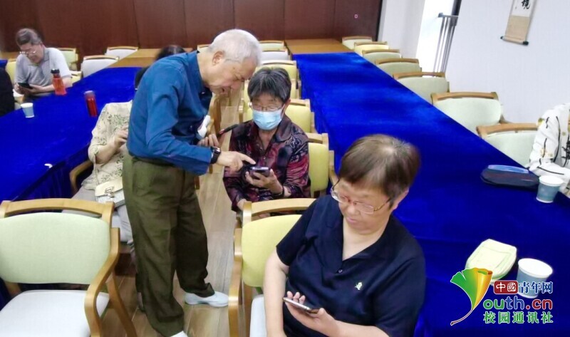图为老年人之间互相帮助解决手机使用问题。中国青年网通讯员 姜卜凡 供图