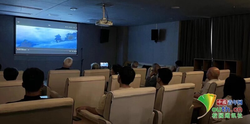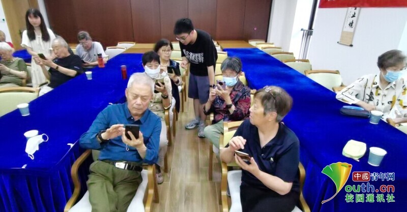 图为老年人邀请志愿者们一起进行观影活动。中国青年网通讯员 姜卜凡 供图