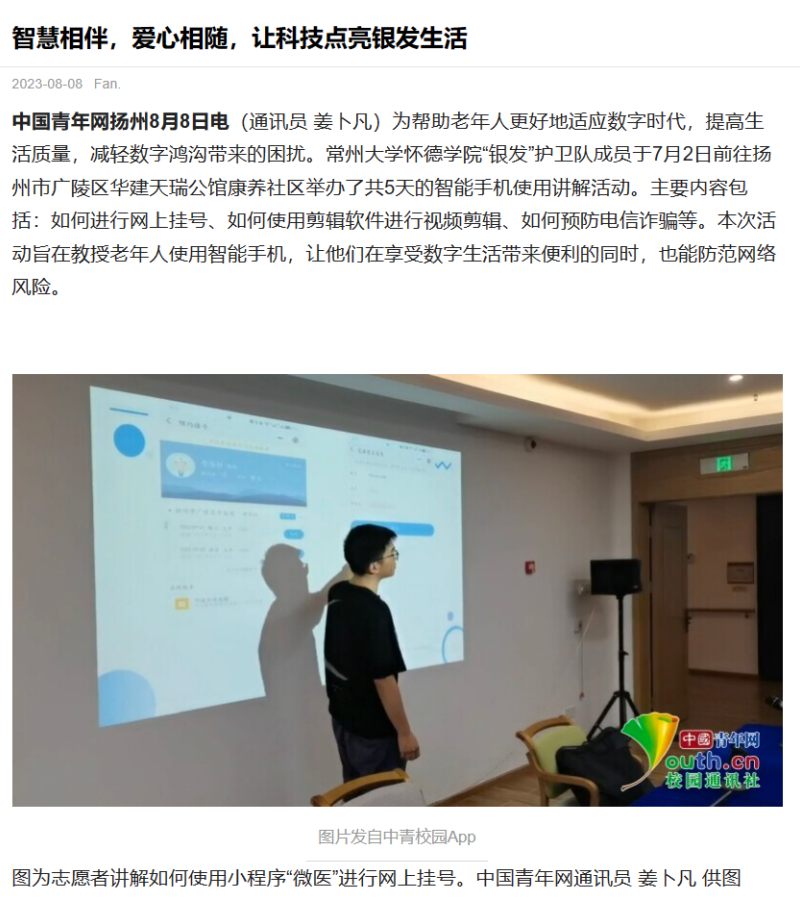 中国青年网扬州8月8日电(通讯员 姜卜凡)为帮助老年人更好地适应数字时代,提高生活质量,减轻数字鸿沟带来的困扰。常州大学怀德学院“银发”护卫队成员于7月2日前往扬州市广陵区华建天瑞公馆康养社区举办了共5天的智能手机使用讲解活动。主要内容包括:如何进行网上挂号、如何使用剪辑软件进行视频剪辑、如何预防电信诈骗等。本次活动旨在教授老年人使用智能手机,让他们在享受数字生活带来便利的同时,也能防范网络风险。