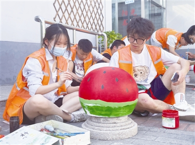 5月15日下午,靖城街道玉皇殿社区内,8名来自常州大学怀德学院的志愿者带着颜料工具,在石墩、井盖旁,拿起画笔构图、起形、调色、涂色,为隔离石墩进行创意彩绘,为社区增添靓丽元素。