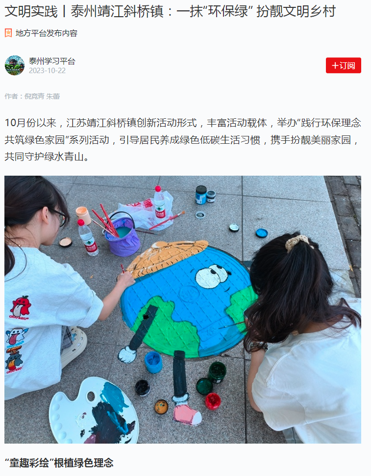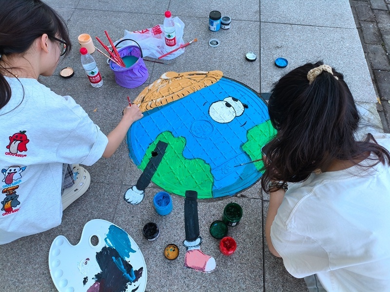 10月15日下午,斜桥镇港阜社区联合常州大学怀德学院艺术系开展“彩绘妙想 定义你心中的绿色”环保主题活动。在大学生志愿者的指导下,孩子们挥洒创意、驰骋色彩,以一方方小小的窨井盖为画布,创作出“保护地球母亲”“低碳出行”“警惕塑料滥用”等环保主题彩绘。一幅幅色彩斑斓的创意环保彩绘在扮靓社区环境的同时,也用润物无声的方式提醒居民绿色出行、低碳生活。