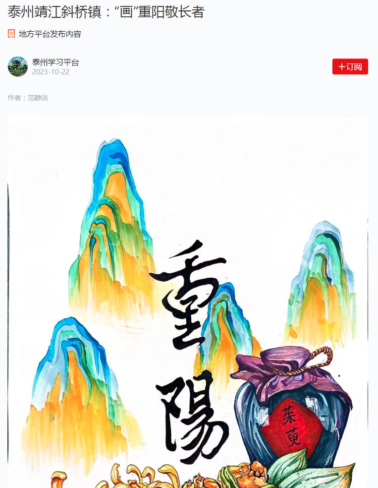重阳节是一个承载着优良传统和美好寓意的节日。在重阳节这天,古人有佩茱萸、登高、赏菊、饮酒等习俗。江苏靖江斜桥镇的同学们执画笔描绘浓浓重阳情,为老人们送上节日的祝福。 “学习强国”泰州学习平台编辑部 电话:0523-86193299