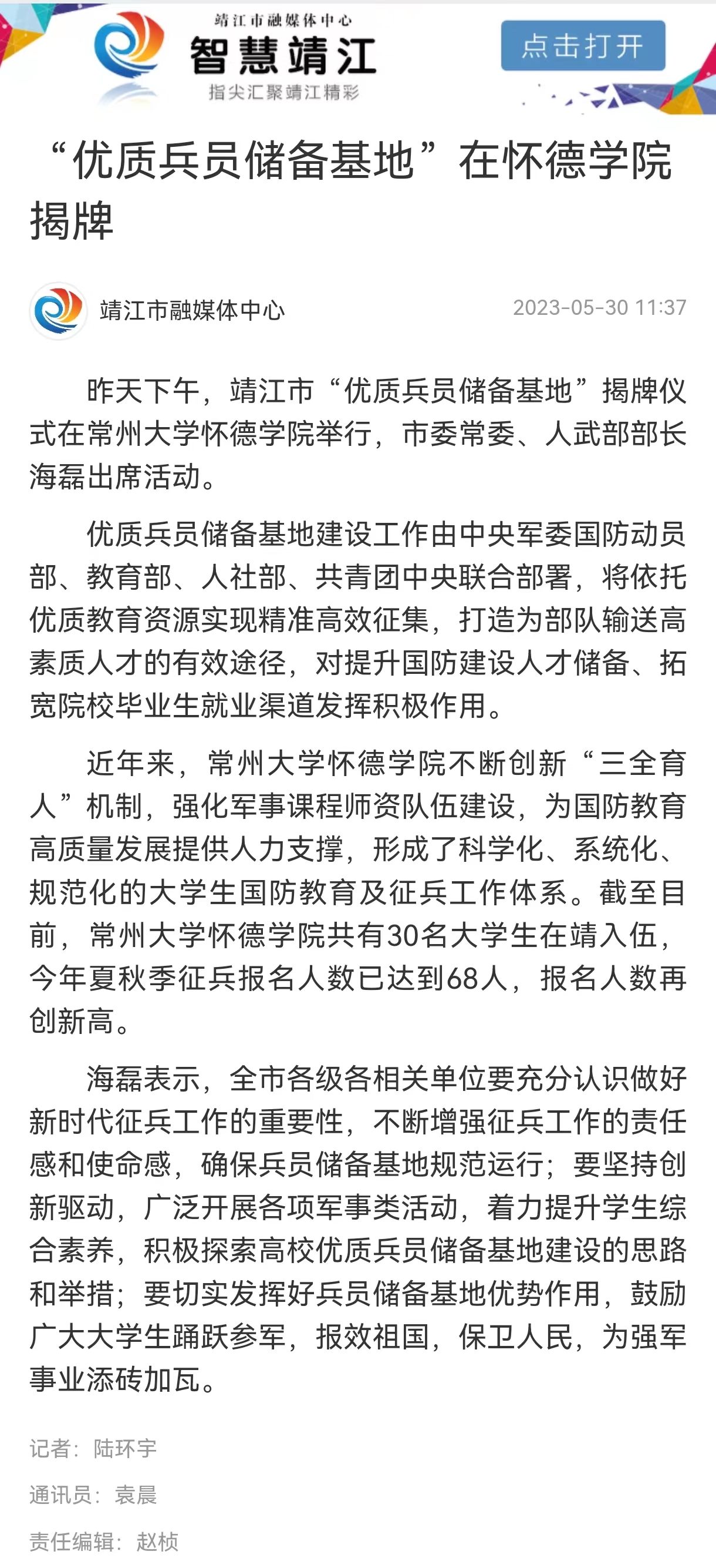 昨天下午,靖江市“优质兵员储备基地”揭牌仪式在常州大学怀德学院举行,市委常委、人武部部长海磊出席活动。