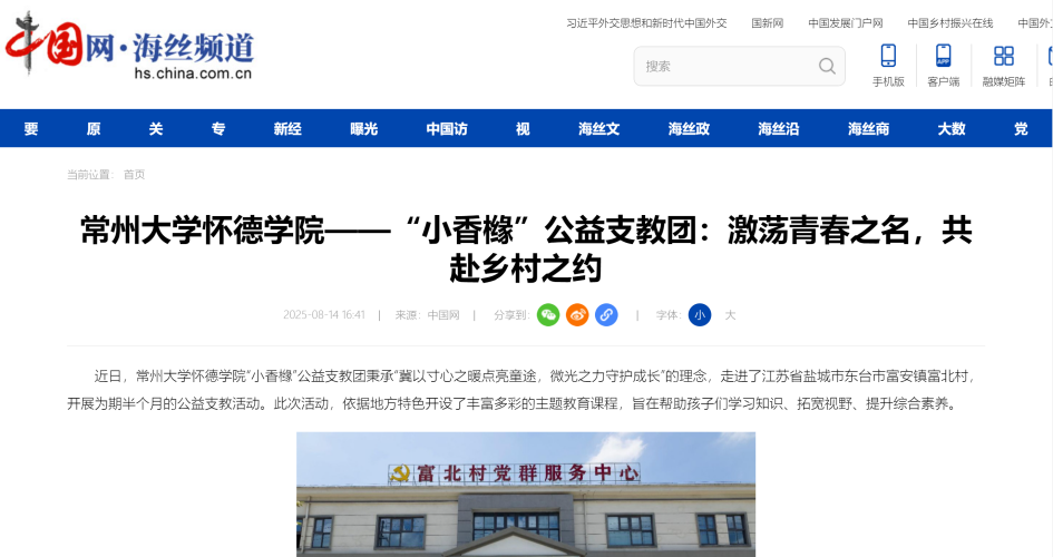 “小香橼”公益支教团由靖江市怀德志愿者协会发起,联合常州大学怀德学院全体师生、爱心企业和当地政府共同组建,自组建以来始终致力于改善残障儿童、留守儿童的教育及生活环境。支教活动于7月中旬正式启动,支教团成员们迅速融入当地环境,与小朋友们建立了深厚的友谊。将连续几年的实践经历和富北村儿童的实际情况相结合,支教团成员以“满足乡村儿童真实需求、促进其全面健康成长”为核心,兼顾知识传授、能力培养、文化传承和安全守护,有针对性地设计课程方案,包括党史爱国、环保节粮、艺术手工、科学探索等,旨在从多个方面促进孩子们的全面发展。