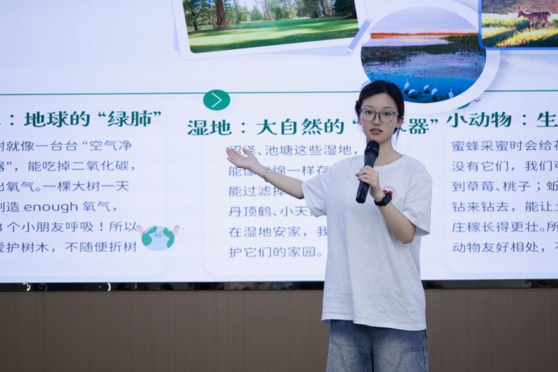 课堂上,支教团成员季陆宇通过绘本故事和动画短片,向孩子们阐释了爱护花草树木、节约水资源等环保小知识。她从身边的花草树木讲到江河湖海,用生动的比喻讲解“为什么要保护环境”,告诉孩子们节约一张纸、一滴水都是环保行动。还结合图片教大家认识可回收物、厨余垃圾等不同种类的垃圾。最受欢迎的当属垃圾分类小游戏,孩子们分组竞赛,将写有“塑料瓶”“菜叶”“废电池”等的卡片准确投入对应的分类垃圾桶,现场笑声不断,大家在玩乐中轻松掌握了分类技巧。