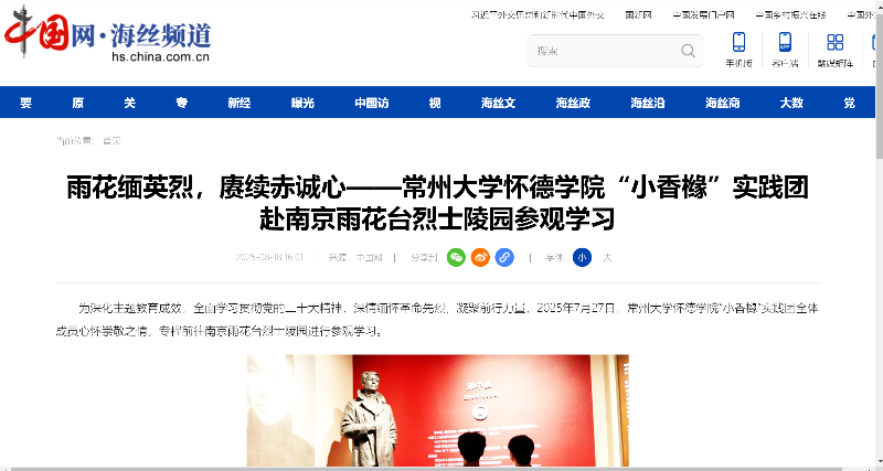 为深化主题教育成效,全面学习贯彻党的二十大精神,深情缅怀革命先烈,凝聚前行力量,2025年7月27日,常州大学怀德学院“小香橼”实践团全体成员心怀崇敬之情,专程前往南京雨花台烈士陵园进行参观学习。