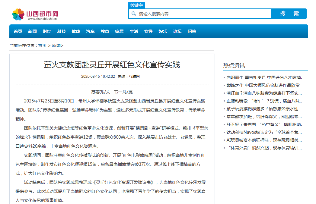 2025年7月25日至8月10日,常州大学怀德学院萤火支教团赴山西省灵丘县开展红色文化宣传实践活动。团队以传承红色基因,弘扬革命精神为主题,通过多元形式开展红色文化宣传教育,传承革命精神。