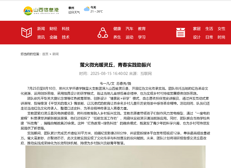 7月25日至8月10日,常州大学怀德学院萤火支教团深入山西省灵丘县,开展红色文化传承实践。团队依托当地的红色革命文化资源,运用创新思维,采用独具设计的研学模式,既让当地儿童感悟革命精神,也为实现乡村可持续发展提供创新思路。