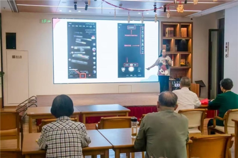 图为志愿者在向社区老人们讲解抖音拍摄的基础操作。志愿者借助大屏幕,清晰展示了抖音界面中“+”号拍摄按钮的位置,以及拍摄时可选择的音乐、滤镜等功能选项。台下老人们聚精会神地听讲,眼神紧紧跟随着屏幕上的内容。旁边还有志愿者人员,时刻准备着为老人们提供一对一的帮助,引导老人跟上讲解步骤,努力照顾到每一位老人,助力他们学会用抖音记录生活,拥抱数字时代的乐趣。