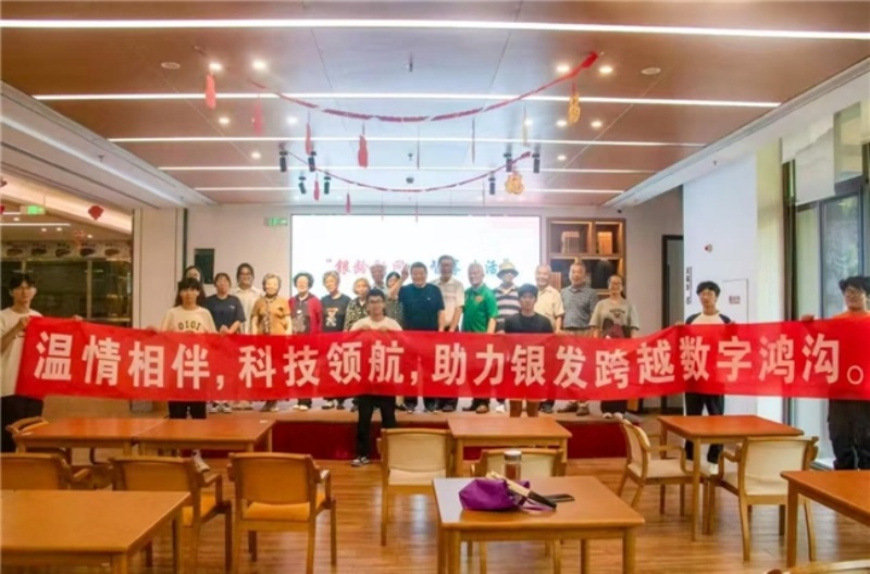 图为活动结束后,志愿者们和参与抖音学习的老人们合影留念。大家脸上都洋溢着开心的笑容,红色横幅上“温情相伴,科技领航,助力银发跨越数字鸿沟”的字样格外醒目。这次教老人用抖音拍视频的活动,不仅让老人们掌握了新的技能,感受到了科技带来的便捷与快乐,也搭建起了代际之间沟通的桥梁,让老人们在数字浪潮中不再“掉队”,更好地融入智能生活。