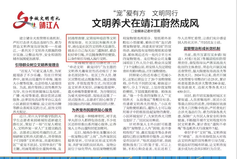 近日,常州大学怀德学院的大学生志愿者来到靖城街道新建北路社区,策划了一场“汪星人喵星人,文明养宠一家人!”主题实践活动。志愿者以轻松有趣的方式,详细讲解文明养犬的要点,并带领孩子们围绕“文明养宠,共建和谐社区”“爱宠不扰民,文明伴我行”等主题,用画笔描绘出遛狗牵绳、及时清理粪便、定期接种疫苗等文明养宠场景。社区居民朱敏养犬多年,她也是社区的文明养犬监督员,她表示自己每天出门遛狗时,都会拉好牵引绳,并且随身携带拾便袋,以身作则引导他人践行文明。