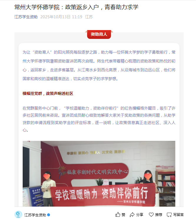 【江苏学生资助】常州大学怀德学院:政策返乡入户,青春助力求学