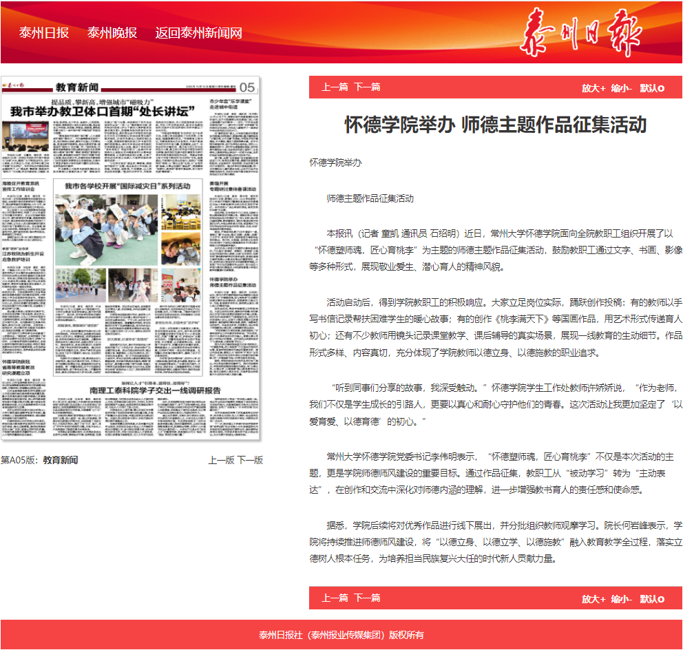 本报讯(记者 童凯 通讯员 石绍明)近日,常州大学怀德学院面向全院教职工组织开展了以“怀德塑师魂,匠心育桃李”为主题的师德主题作品征集活动,鼓励教职工通过文字、书画、影像等多种形式,展现敬业爱生、潜心育人的精神风貌。