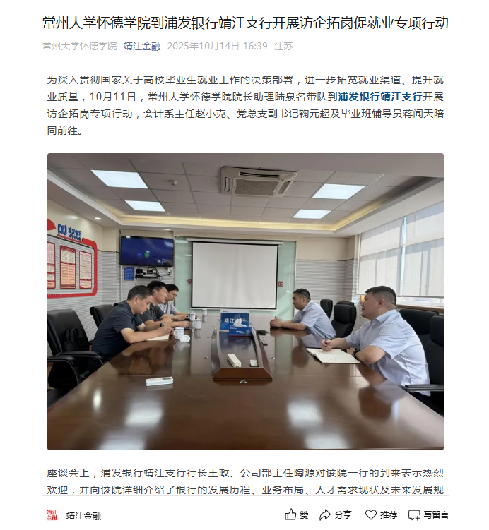 为深入贯彻国家关于高校毕业生就业工作的决策部署,进一步拓宽就业渠道、提升就业质量,10月11日,常州大学怀德学院院长助理陆泉名带队到浦发银行靖江支行开展访企拓岗专项行动,会计系主任赵小克、党总支副书记鞠元超及毕业班辅导员蒋闻天陪同前往。