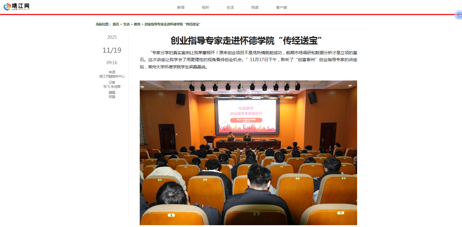 “专家分享的真实案例让我茅塞顿开!原来创业项目不是凭热情就能成功,前期市场调研和数据分析才是立项的基石。这次讲座让我学会了用更理性的视角看待创业机会。”11月17日下午,聆听了“创富泰州”创业指导专家的讲座后,常州大学怀德学院学生梁晶晶说。
