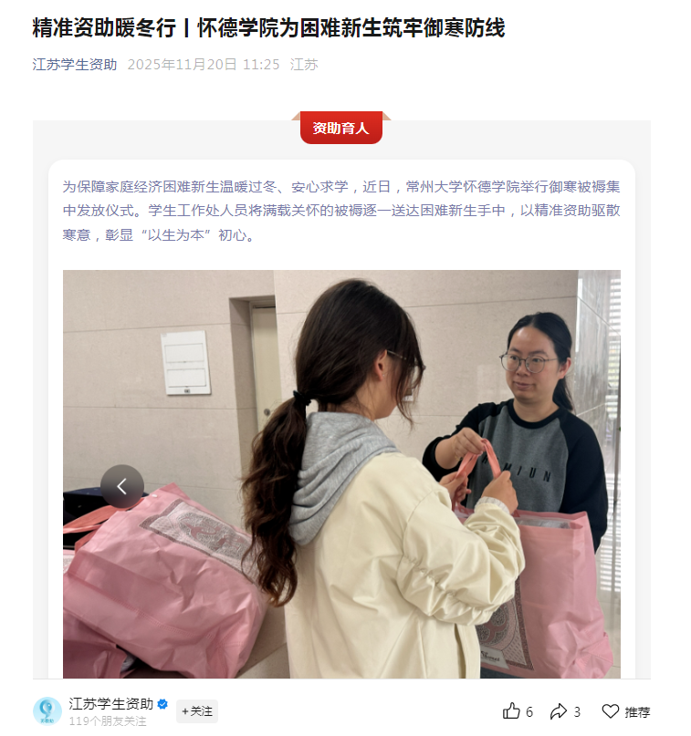 为保障家庭经济困难新生温暖过冬、安心求学,近日,常州大学怀德学院举行御寒被褥集中发放仪式。学生工作处人员将满载关怀的被褥逐一送达困难新生手中,以精准资助驱散寒意,彰显“以生为本”初心。