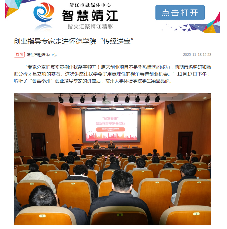 “专家分享的真实案例让我茅塞顿开!原来创业项目不是凭热情就能成功,前期市场调研和数据分析才是立项的基石。这次讲座让我学会了用更理性的视角看待创业机会。”11月17日下午,聆听了“创富泰州”创业指导专家的讲座后,常州大学怀德学院学生梁晶晶说。