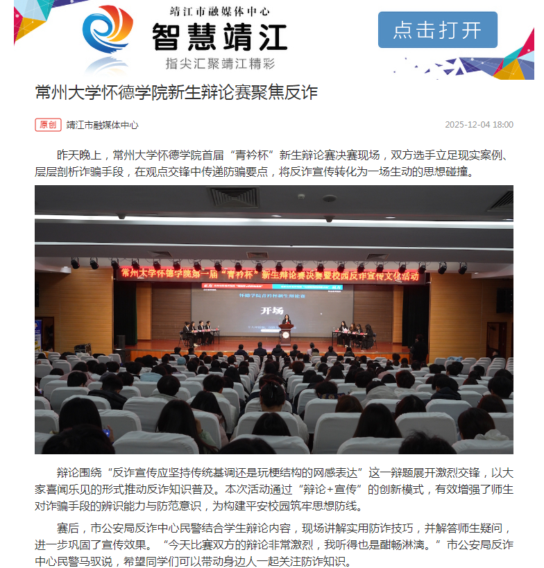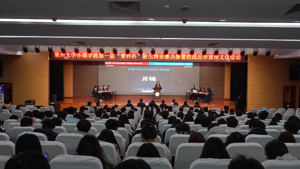 昨天晚上,常州大学怀德学院首届“青衿杯”新生辩论赛决赛现场,双方选手立足现实案例、层层剖析诈骗手段,在观点交锋中传递防骗要点,将反诈宣传转化为一场生动的思想碰撞。