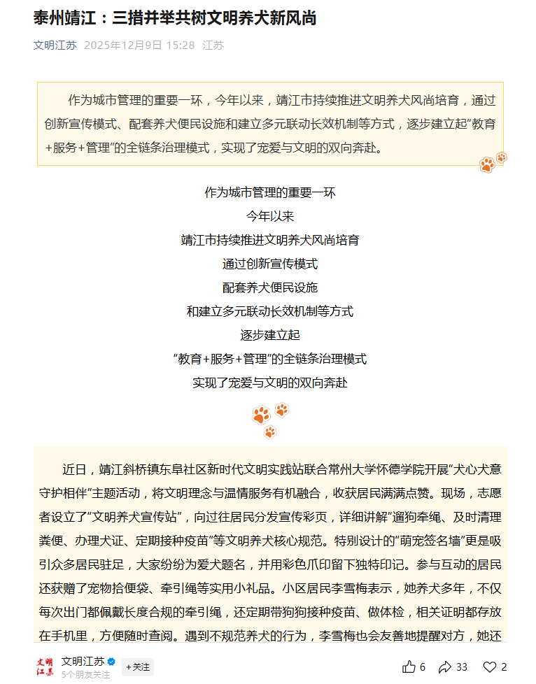 作为城市管理的重要一环,今年以来,靖江市持续推进文明养犬风尚培育,通过创新宣传模式、配套养犬便民设施和建立多元联动长效机制等方式,逐步建立起“教育+服务+管理”的全链条治理模式,实现了宠爱与文明的双向奔赴。