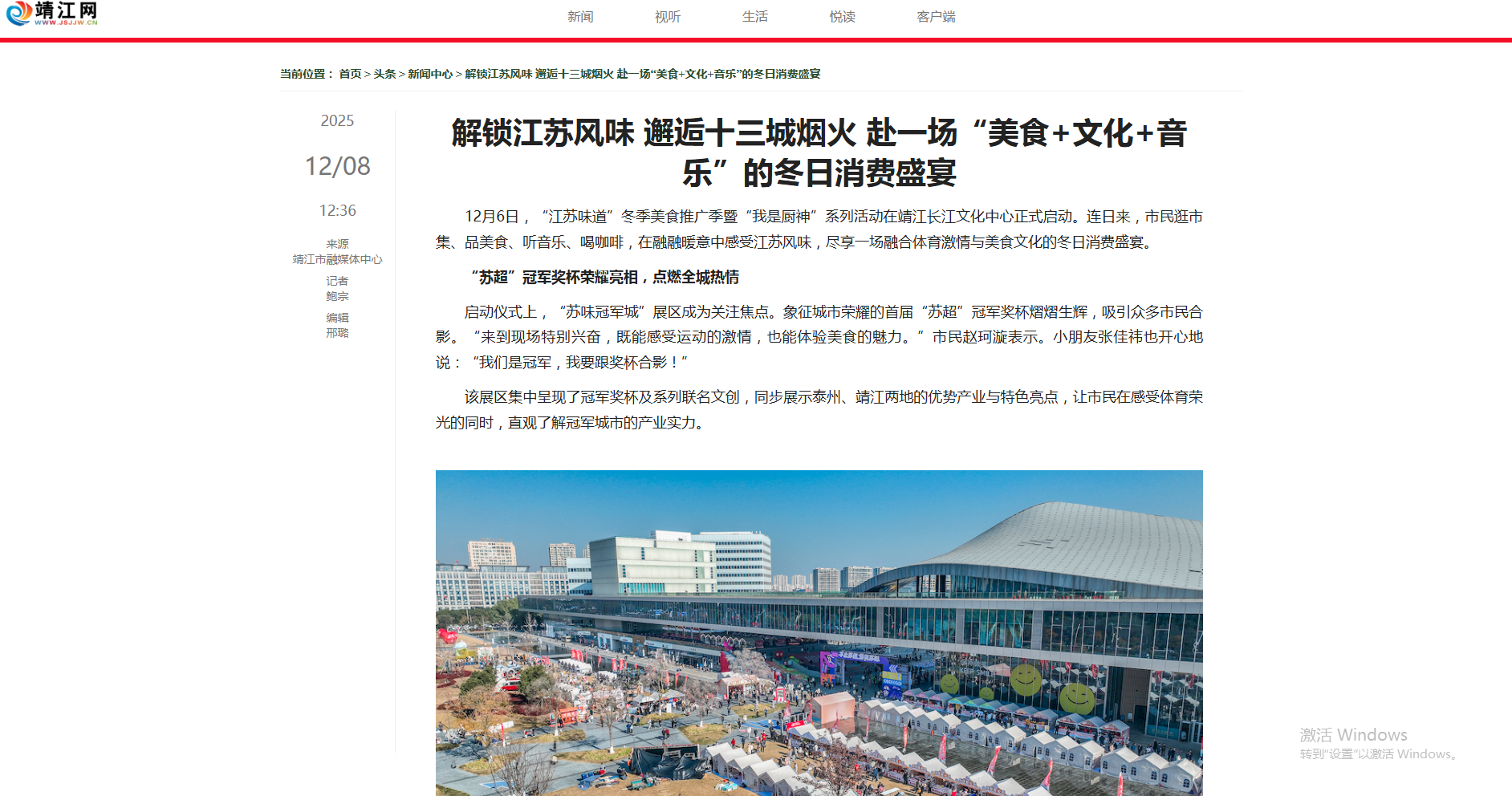 12月6日,“江苏味道”冬季美食推广季暨“我是厨神”系列活动在靖江长江文化中心正式启动。连日来,市民逛市集、品美食、听音乐、喝咖啡,在融融暖意中感受江苏风味,尽享一场融合体育激情与美食文化的冬日消费盛宴。