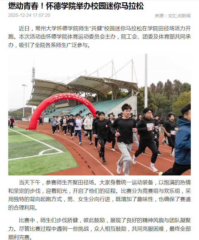 近日,常州大学怀德学院师生“共健”校园迷你马拉松在学院田径场活力开跑。本次活动由怀德学院体育运动委员会主办,院工会、团委及体育部共同承办,吸引了全院各系师生广泛参与。