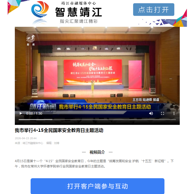 4月15日是第十一个“4·15”全民国家安全教育日,今年的主题是“统筹发展和安全 护航‘十五五’新征程”。下午,靖江市在常州大学怀德学院举行全民国家安全教育日主题活动。